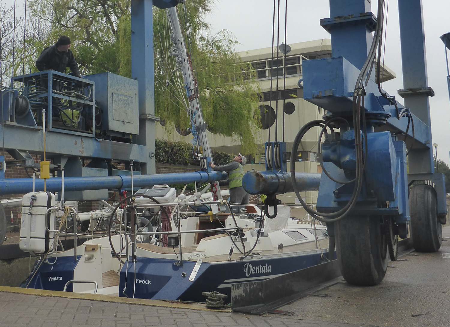 The mast is out and Ventata seems bare without her rig!  The marina staff thankfully made a good job of taping over the hole in the deck; even with all that rain it hasn’t leaked a drop.  We weren’t really expecting them to leave the boom inside the boat.  Good for security but rather an obstacle in the saloon – making tea has become rather an acrobatic feat so I don’t think it will be staying there.